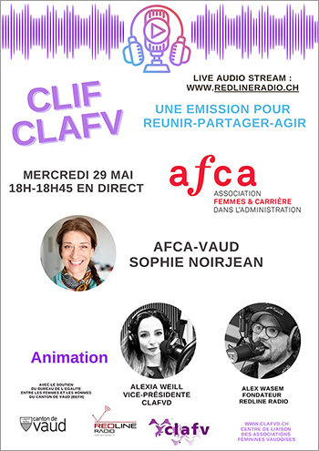 Afca Emission du 29 mai 2024 sur Redline-Radio Invitée Sophie Noirjean, afca-Vaud Animé par Alexia Weil, vice-présidente CLAFVD et Alex Wasem Article précédent : BEFH Précédent Article suivant : BPW Vaud Suivant